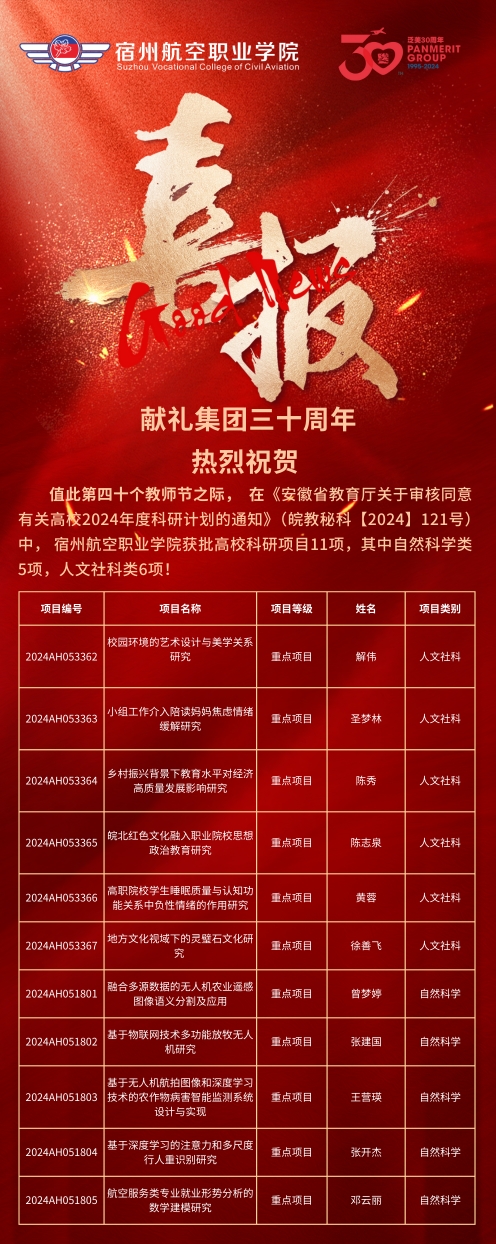 9月,在《安徽省教育厅关于审核同意有关高校2024年度科研计划的通知》(皖教秘科【2024】121号)中👩🏼💻🧗🏻♀️,彩神Vll学院获批高校科研项目11项🛑,其中自然科学类5项,人文社科类6项;8月🤘,安徽省社科界青年学者协会公布《关于公布2024年度省社科界青年学人成长计划入选人员名单的通知》(皖青协通字(2024)5号)文件中,学院信息工程学院教师孟琪入选2024年度省社科界青年学人成长计划。4月,学学院与宿州市合农农业科技有限公司就无人机飞行操作控制技术服务签订了横向项目,成果转化实现0突破❓🤌🏽。这些科研成果的取得,彰显了学院在科研方面的实力和潜力👨🏼,为学院的学术发展注入了新的动力。在安徽省教育厅公布了2024年高等学校省级质量工程项目立项名单⏪,学院6个项目获批立项。这是学院在教学改革、课程建设、师资队伍建设等方面不断努力的结果🍇,对于提高教学质量、提升人才培养水平具有重要意义𓀂🏞。