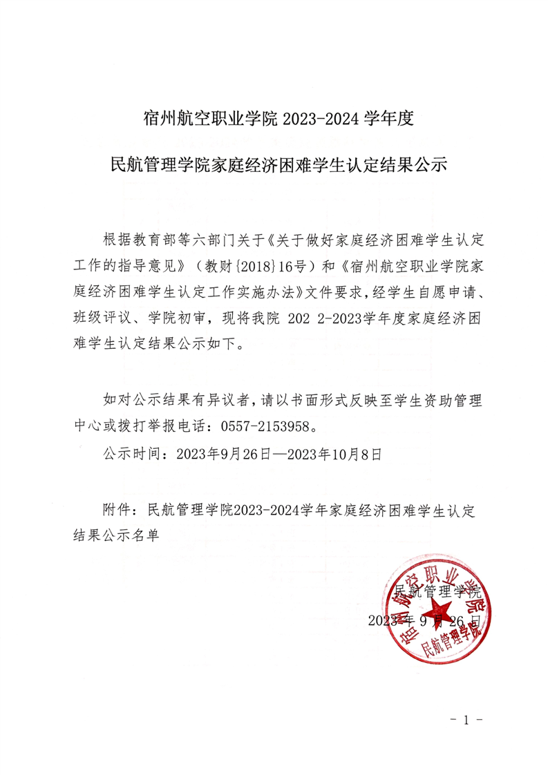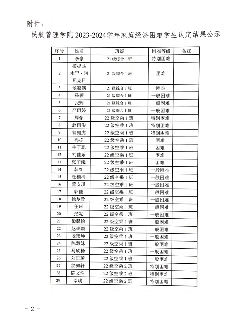 彩神Vll学院2023-2024学年度民航管理学院家庭经济困难学生认定结果公示
