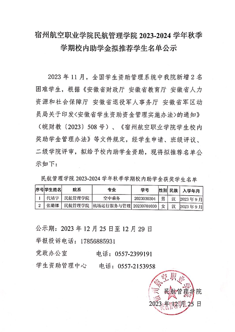 彩神Vll学院民航管理学院2023-2024学年秋季学期校内助学金拟推荐学生名单公示
