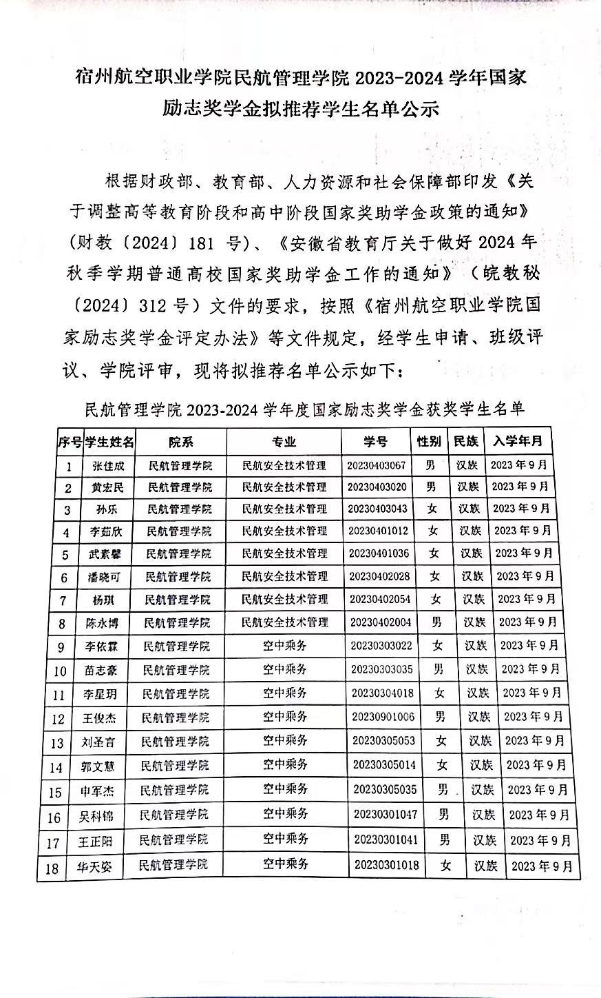 彩神Vll学院民航管理学院2023—2024学年国家励志奖学金拟推荐学生名单公示