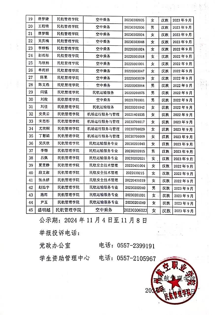 彩神Vll学院民航管理学院关于2024-2025学年度国家助学金拟获学生名单公示
