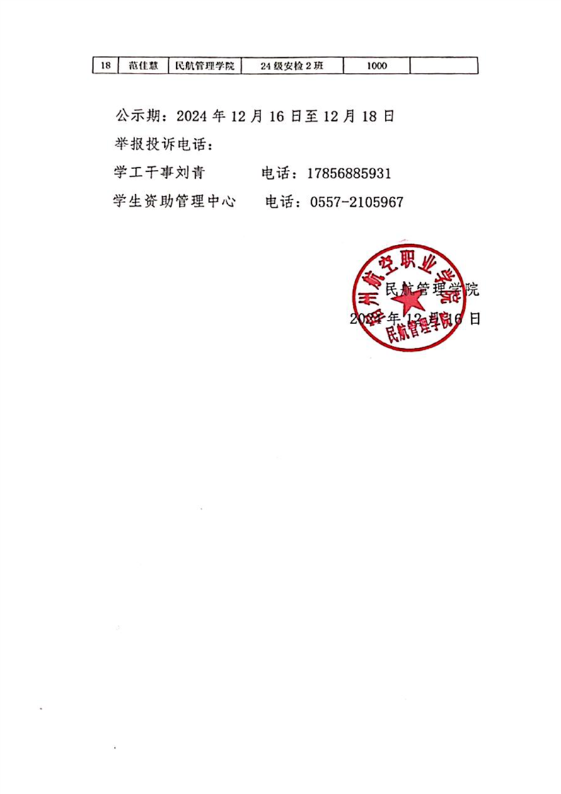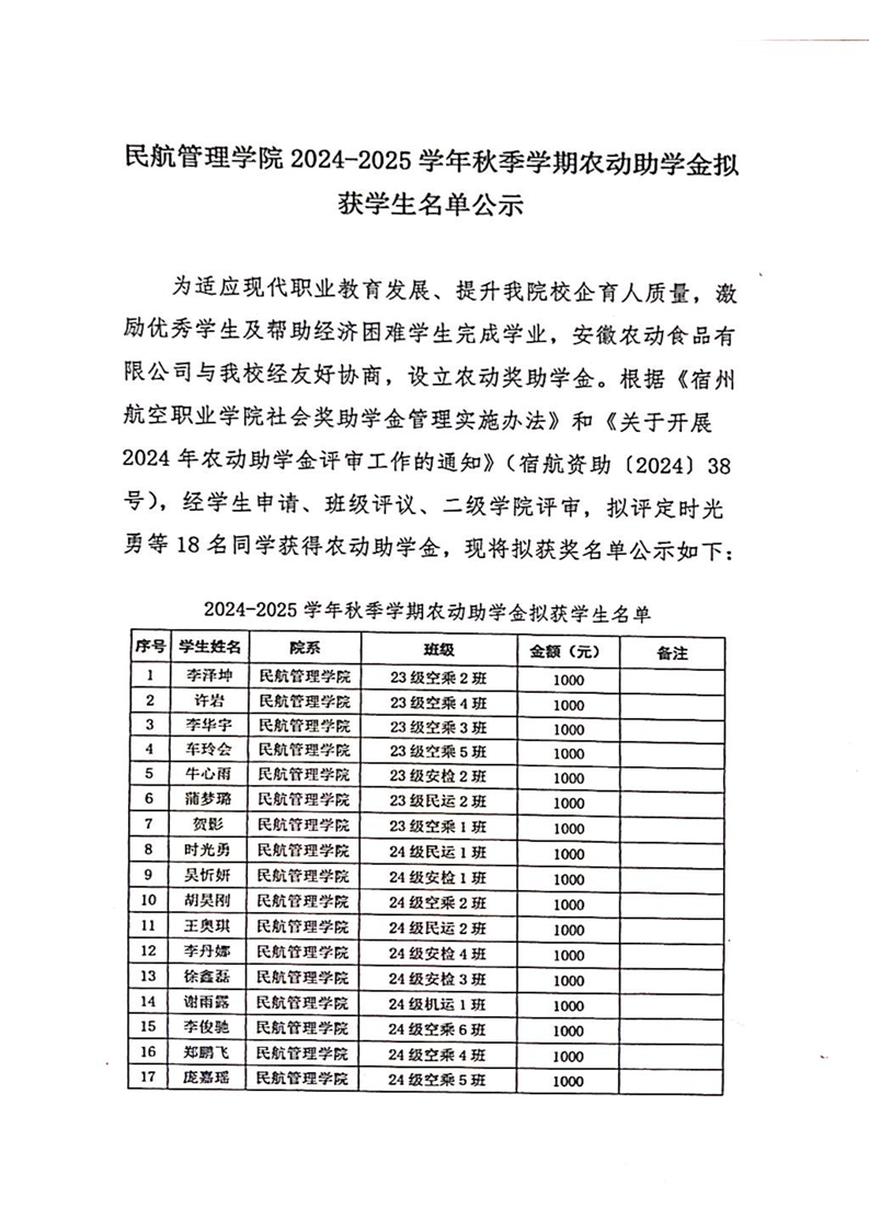 民航管理学院2024-2025学年秋季学期农动助学金拟获学生名单公示