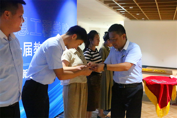 在接下来的环节中,二级学院负责人王新桥为每一位教师发放工牌,一枚小小的工牌,承载了泛美人的教育使命,更承载了一份坚实的责任。