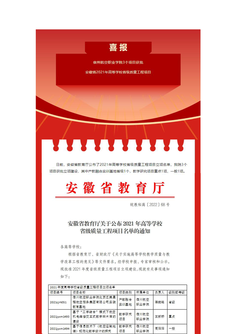 安徽省教育厅关于公布2021年高等学校省级质量工程项目名单的通知