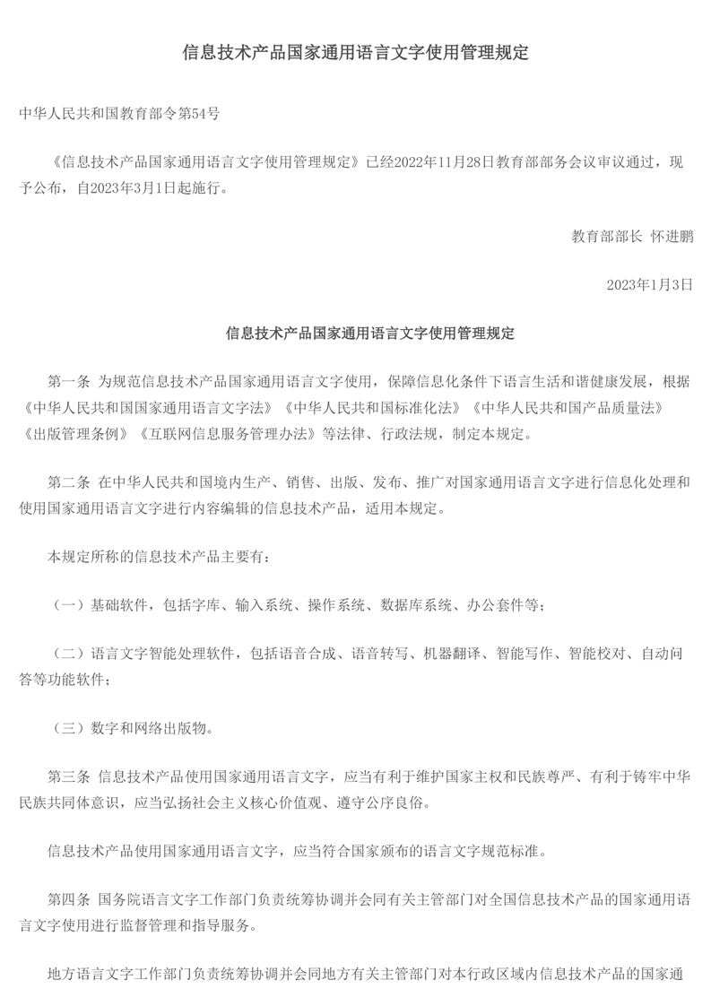 信息技术产品国家通用语言文字使用管理规定