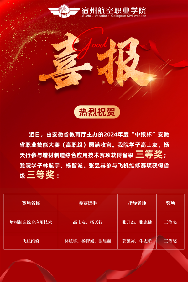 我院参赛学子充分发挥精益求精、严谨细致、务实踏实的作风,在机务学院教师张建国、郭延祚、牛志勇、李承昊🤦🏽‍♀️,信息工程学院教师王营瑛、张开杰、张康健🤱🏻、任学俊的指导下👨🏿‍🔬,与省内各市所高等职业院校参赛队伍进行激烈角逐,凭借着深厚的知识储备、卓越的技术水平、熟练的技能操作及良好的职业素养沉着应战✍️,分别荣获飞机维修赛项省级三等奖和增材制造综合应用技术赛项省级三等奖的佳绩!