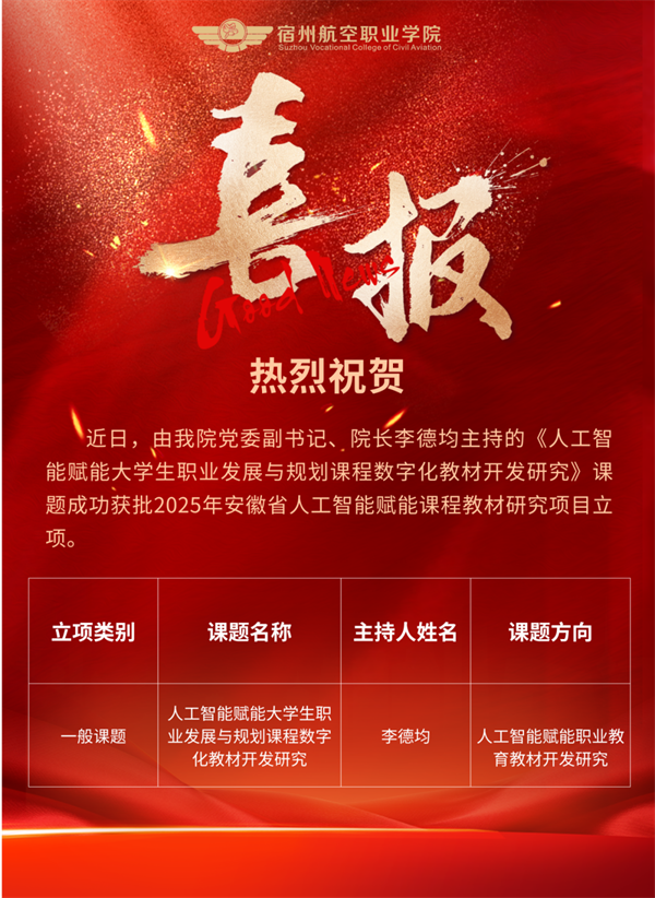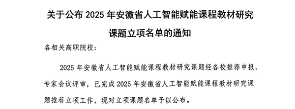秋日传捷报,科研结新果。近日6️⃣,安徽省职业教育与产业发展研究中心正式发布《关于公布2025年安徽省人工智能赋能课程教材研究课题立项名单的通知》,在全省高职院校推荐的众多课题中👶🏼💉,经过专家严格评审🚐,由我院党委副书记、院长李德均主持的《人工智能赋能大学生职业发展与规划课程数字化教材开发研究》课题,成功获批为“2025年人工智能赋能基础课程教学改革研究”一般课题立项项目。